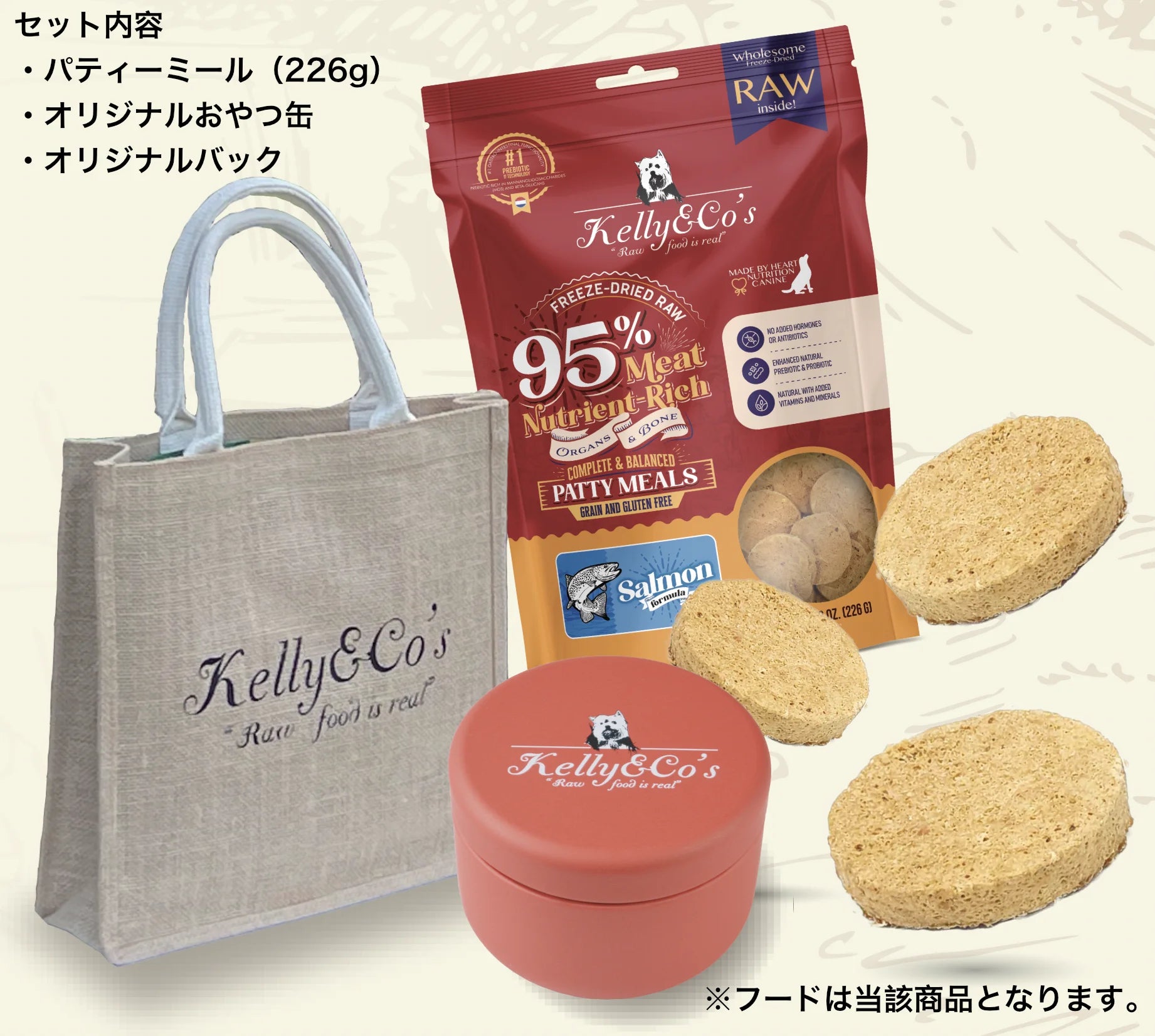 初回限定キットはパティーミール(226g)、ケリーアンドコーオリジナルおやつ缶(通常販売価格1,265円・税込)、オリジナルバックがセットになったお得なキットです。